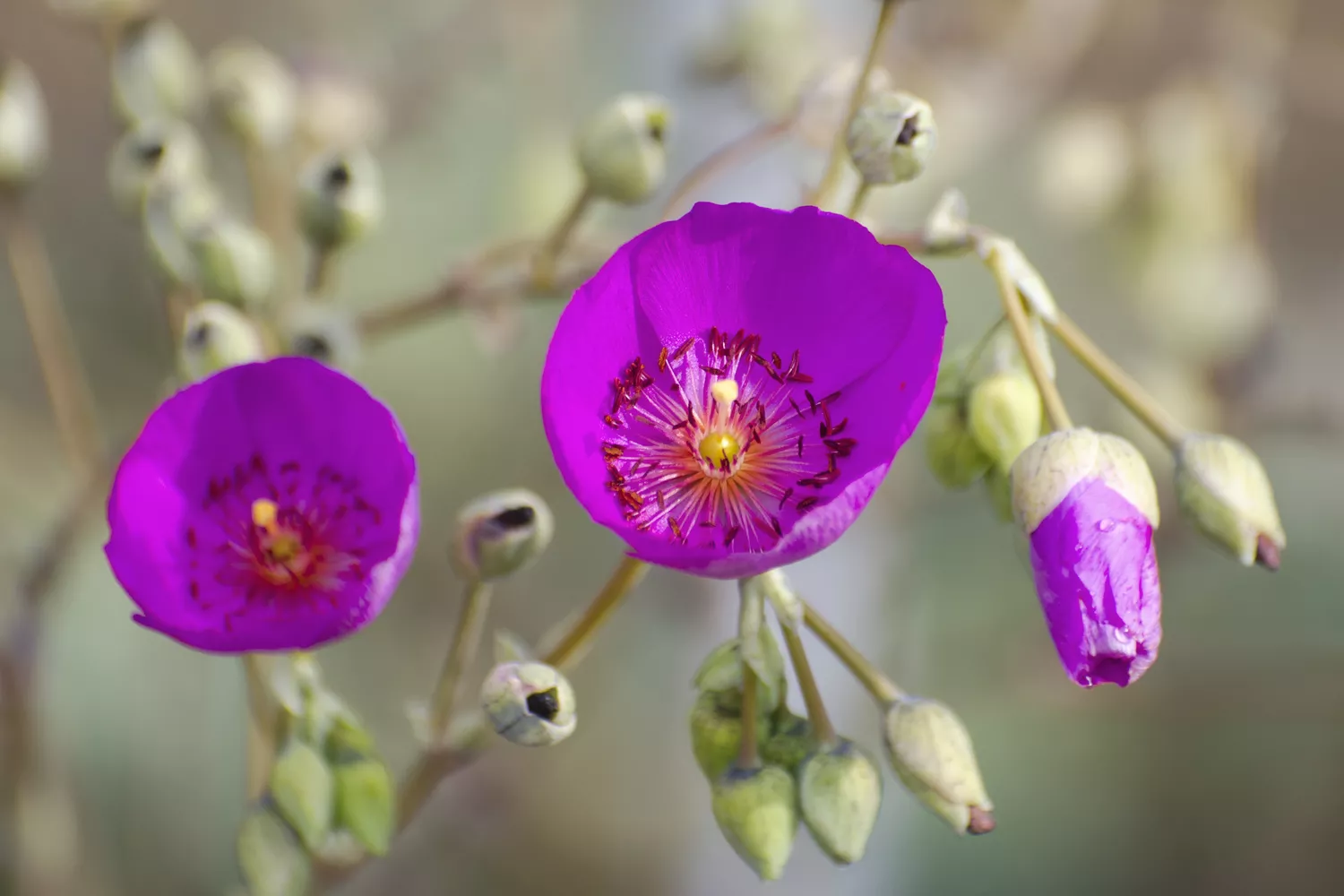 A drought-tolerant succulent from the Atacama Desert, the driest desert in the world, rock purslane requires almost no rainfall once established. Excellent for xeriscaped gardens, especially those that receive a coastal fog, Calandrinia spectabilis has bluish-gray foliage that can absorb moisture from the air. Like other purslanes, it’s a member of the portulaca family. The plant makes an excellent ground сoⱱeг, as it can grow into a thick mound up to four feet wide. With flowers looking like magenta-colored poppies, it is also a pollinator-friendly plant.