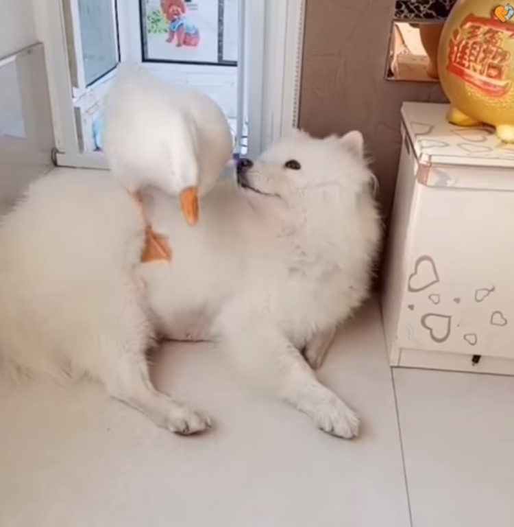 The big white dog gave birth to 6 puppies, all of which were snatched by the big white goose. | DayDayNews