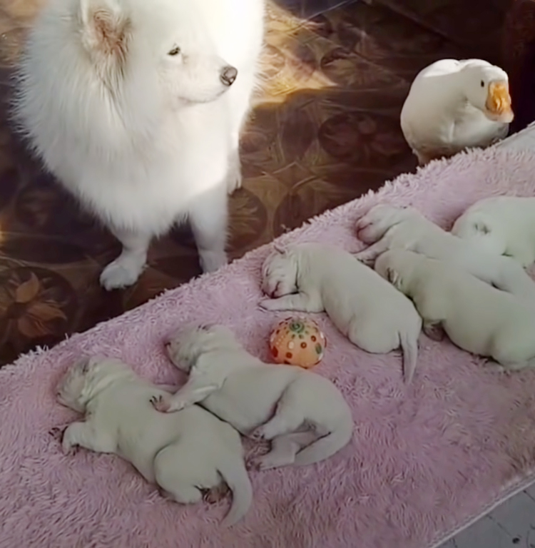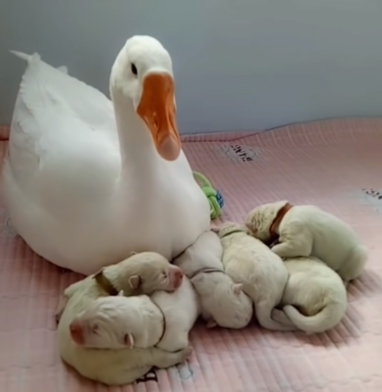 Sweet Goose Becomes The Nanny Of Her Bestie’s Puppies