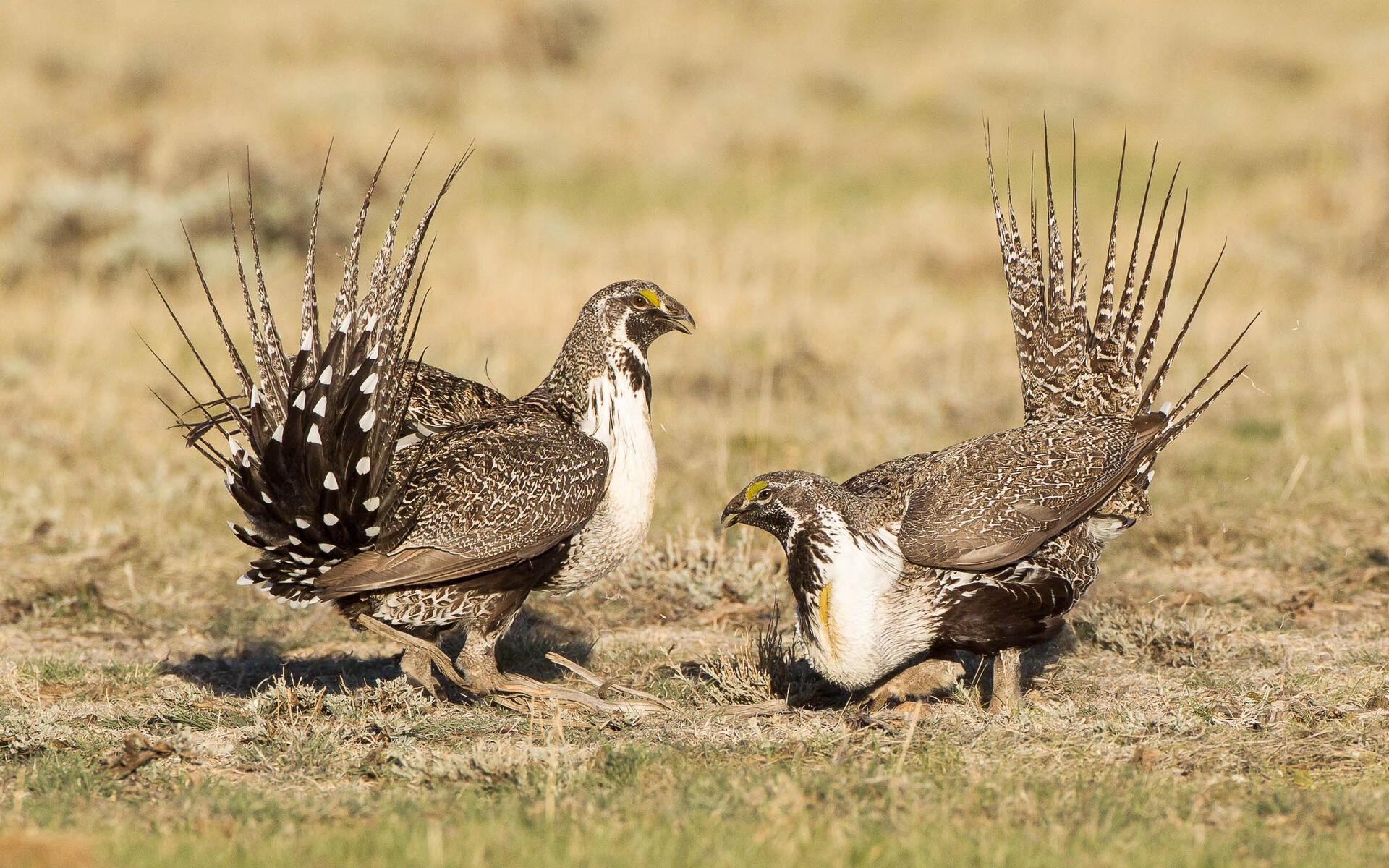 This bird is primarily associated with sagebrush-steppe ecosystems, characterized by vast expanses of sagebrush, native grasses, and scattered shrubs. These habitats provide critical resources for the Greater Sage-Grouse, including food, cover, and nesting sites. They are adapted to live in arid and semi-arid regions across eleven western states in the United States and two provinces in Canada.