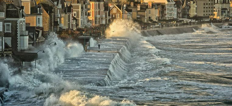 Saint Malo, a historic French port on the English Channel coast, is famous for having the highest tides in Europe, with breakwater defenses barely keeping giant waves from slamming into residential buildings.