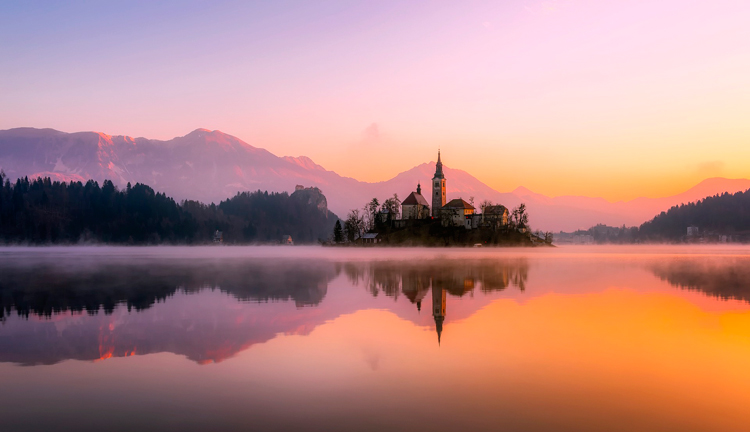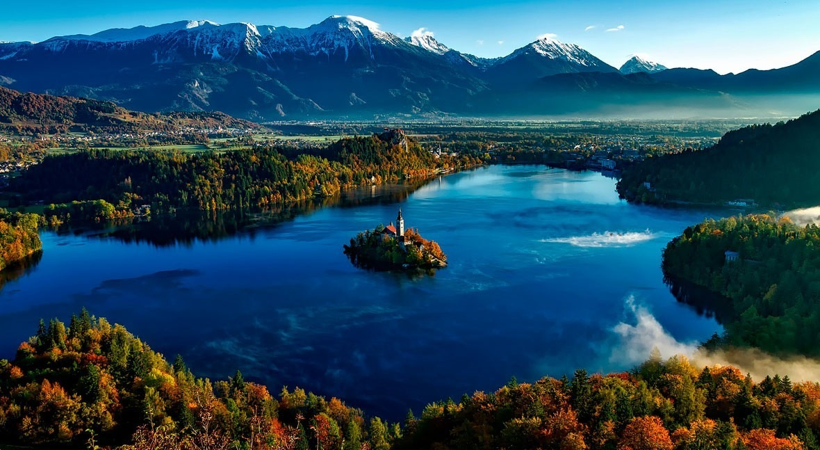 We are in Slovenia, in the Julian Alps, about 60 km from the capital Ljubljana. It is here that we find a place where reality has always mingled with myth. The landscape is typical of postcards. Mountains, blue water, and a small, charming teardrop-shaped island.
