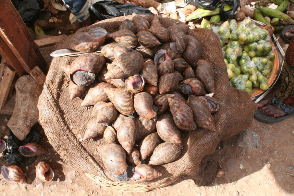Giant African Land Snails being sold at a street market in Kumasi. Image credit: Petr Kosina