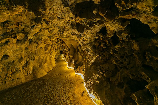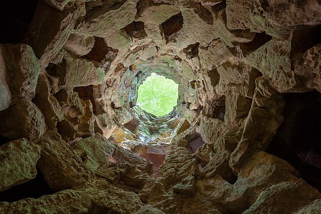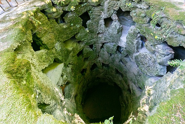 Hidden behind a cluster of moss-covered boulders in a Portuguese garden lies a well. It’s no ordinary well, as you’ll see when you push the stone slab that leads you to the top of an inverted tower that plunges into an underworld. With curving arches flanked by ionic columns, lichen and moss-clad stone dripping with water and 23 mysterious empty niches, the stairway leading you down resembles something out of Pan’s Labyrinth or Susanna Clarke’s novel Piranesi. The mysterious tower spirals down nine flights of stairs to a depth of 27 metres. As you descend into the lower levels, water creeps up the steps as you approach the rose and cream granite flagstones at the base forming a compass shape with a Templar cross at its heart. Once you’ve reached the bottom, an entrance leads you into a subterranean labyrinth illuminated by a single strip of fairy lights guiding you into the darkness.