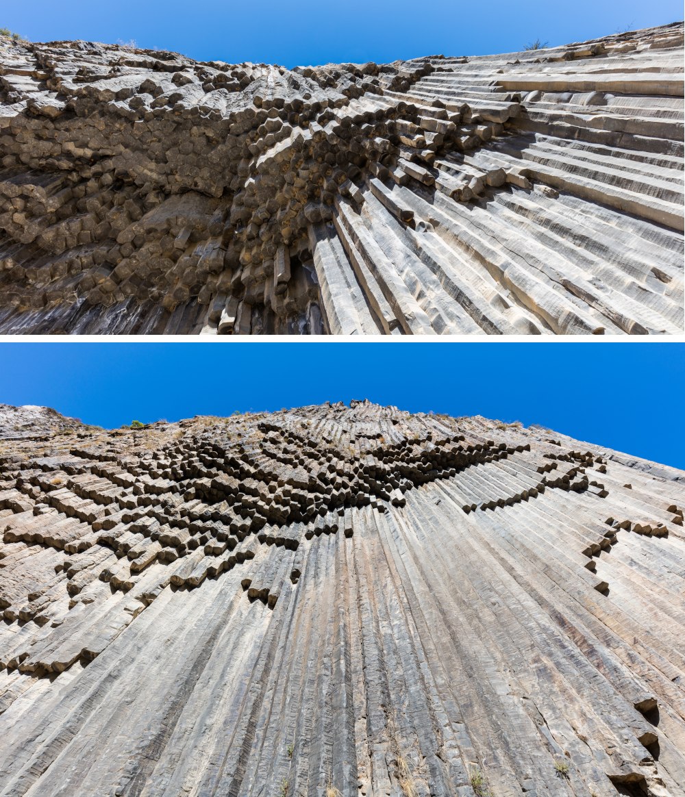 The complex topography of Armenia was shaped by a geological upheaval that pushed up the Earth’s crust to form the Armenian Plateau 25 million years ago. How exactly the columnar jointing was formed is still uncertain, but it is usually explained by analogy with mud-cracks resulting from shrinkage at the surface of dried-up mud. The polygonal cracks in basalt are presumed to be due to contraction during cooling, which acts towards the creation of a series of equally spaced cooling centers. A tension crack is thought to form between two centers and since each center is surrounded by many others, a multi-sided polygonal crack system is formed, splitting the rock into roughly uniform polygonal blocks. As cooling proceeds towards the interior, cracks propagate inward at right angles to the cooling surface, resulting in the distinctive columnar structure.