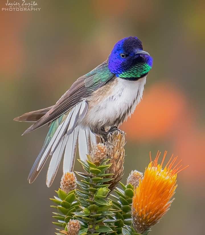 The booted racket-tails are a small group of hummingbirds in the genus Ocreatus where the male has green upperparts and a long bluish tail. He has a snow-white dense feathering around the legs known as “leg puffs” (which are not always visible). These leg puffs have been described as resembling “woolly panties” or “little cotton balls” above the legs.