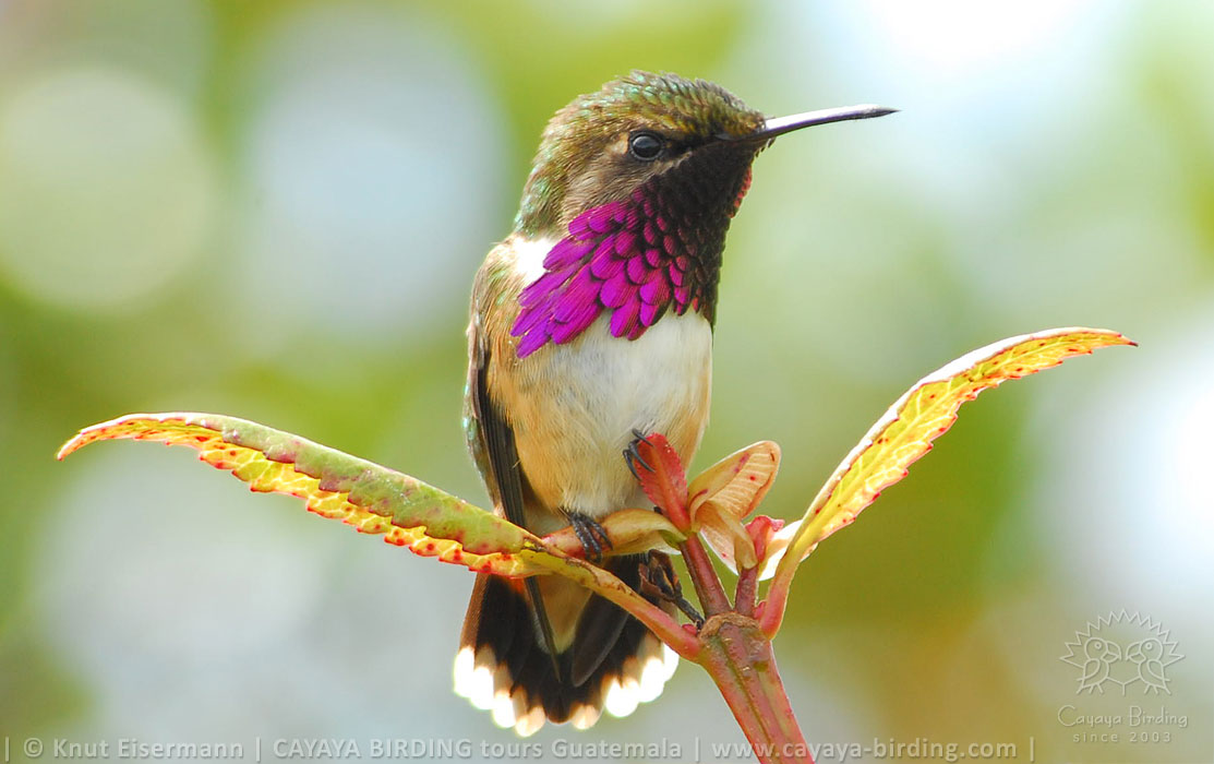 Big for a hummingbird, this species is about 12 cm, weighing in at approximately 8.0 g. The male has a striking violet-purple hood, bordered below by a horizontal black chest stripe.