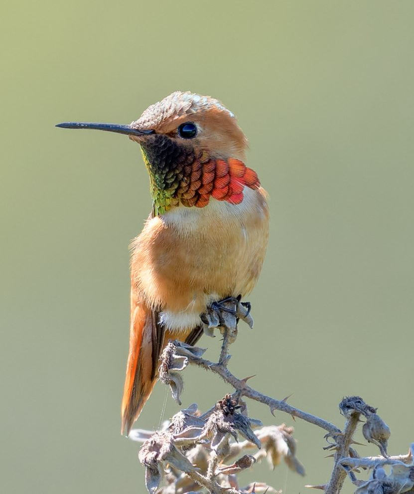 Allen’s hummingbird (Selasphorus sasin) is a species of hummingbird that is one of seven species in the genus Selasphorus. One of the smallest hummingbirds in North America measures only 7.5 to 9 cm long weighing in at 3 grams. The male has a glossy green or bronze-green back and forehead, with rust-colored (rufous) sides and rump (lower back). In some males, the rump is orange.