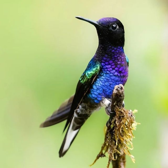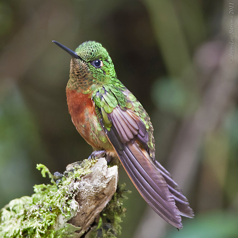 The velvet-purple coronet (Boissonneaua jardini) is a species of hummingbird with highly iridescent plumage, being largely bluish-purple below and on the crown, greenish-blue on the back, green on the upper wing coverts, and rufous on the underwing coverts.
