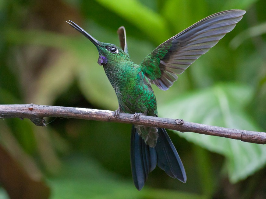 The green-crowned brilliant (Heliodoxa jacula) is a large, robust hummingbird that is a resident breeder in the highlands from Costa Rica to western Ecuador. The male Green-crowned brilliant is 13 cm (5.1 in) long and weighs 9.5 g (0.34 oz). It is mainly bronze-green with a glittering green crown, forehead, throat, and breast. It has a white spot behind the eye, a small violet-blue throat patch, white thighs, and a deeply forked blue-black tail.