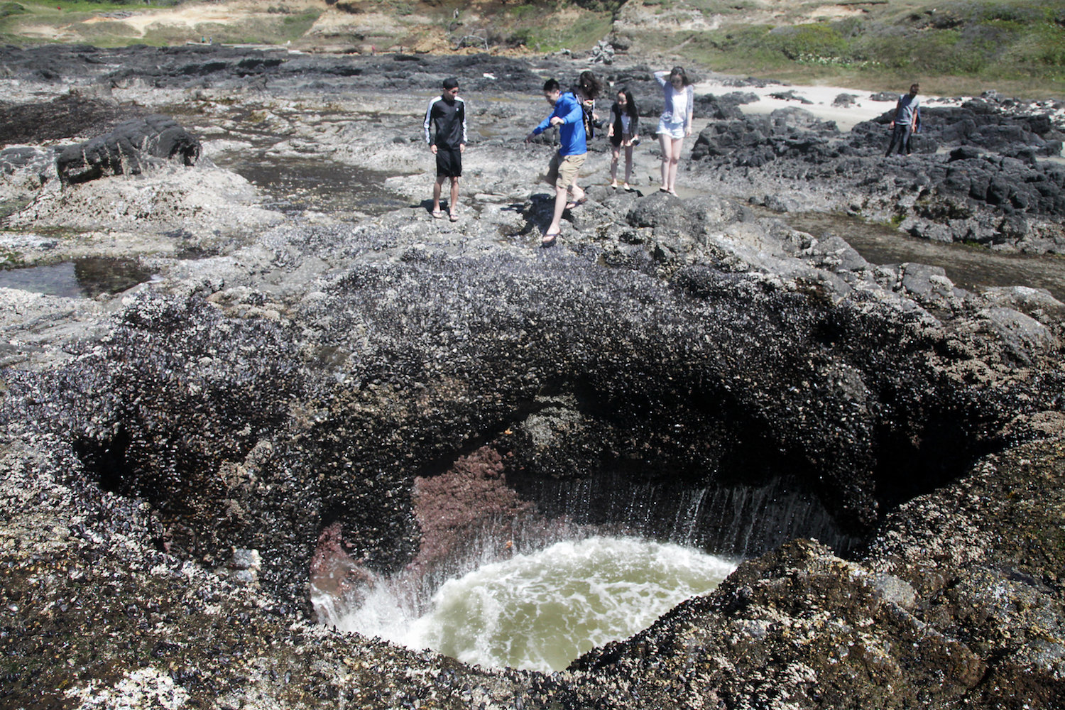 Since May, there have been three incidents at the site, she said, all people who have been hit by sneaker waves while looking at the feature. They didn’t get sucked into the hole (or transported to hell), but got plenty of scrapes and cuts against the sharp volcanic rock.
