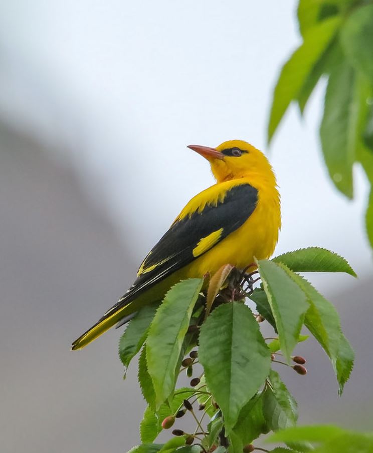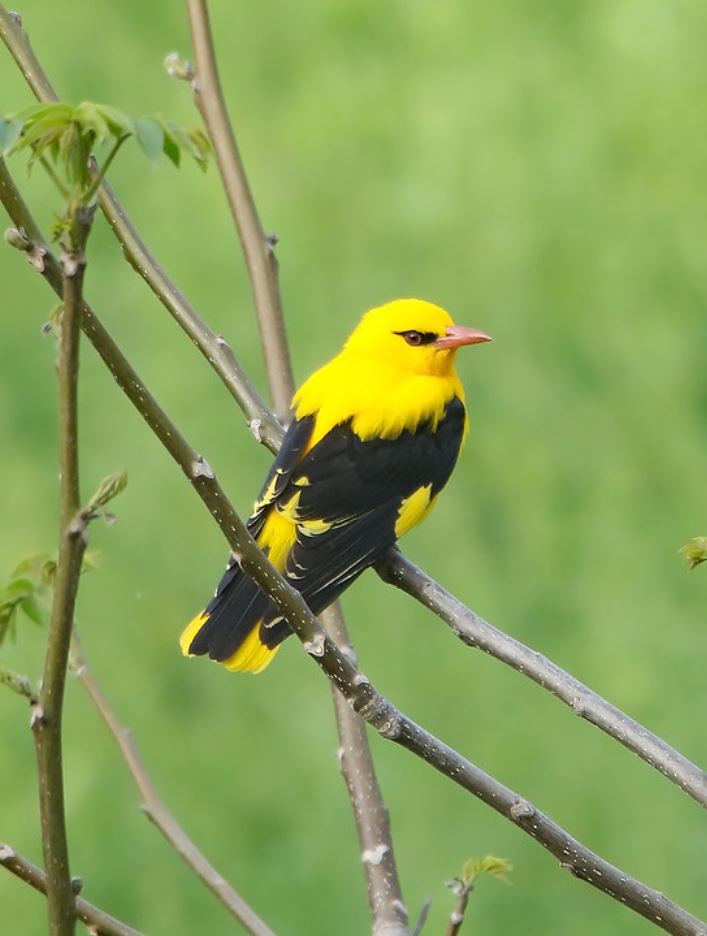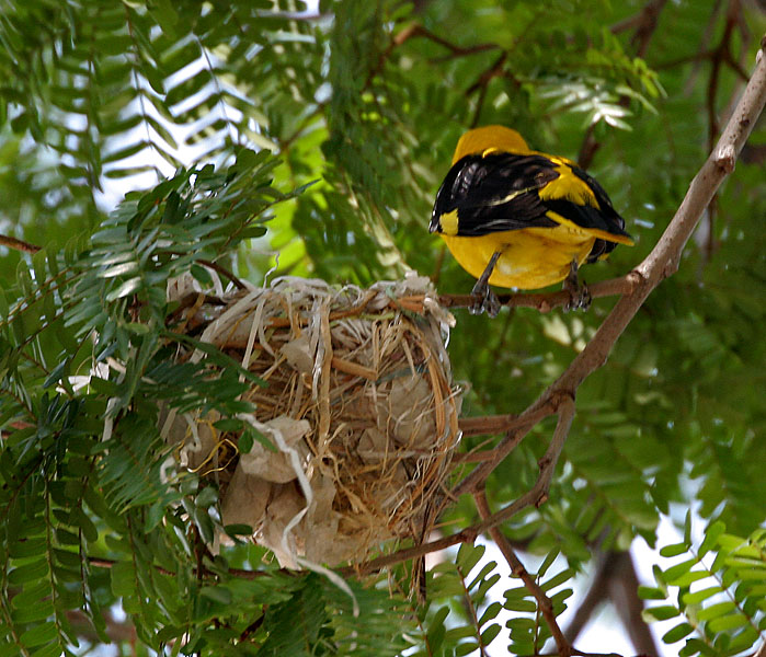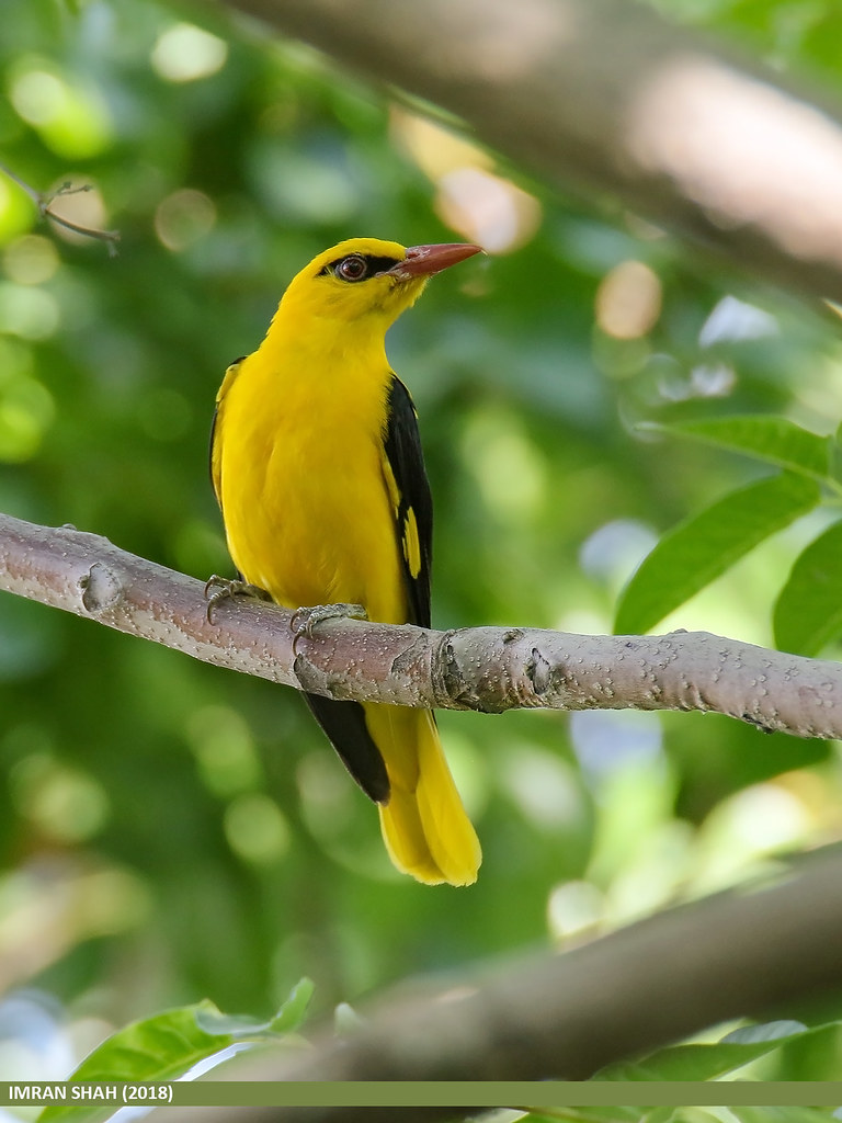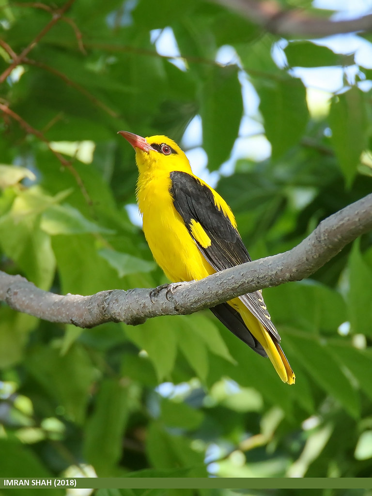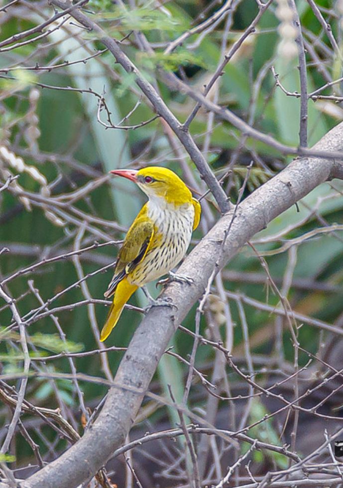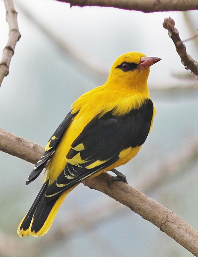 The Indian golden oriole (Oriolus kundoo) is a species of oriole similar to the Eurasian golden oriole but has more yellow on the tale. A large bird, with a strong bill, long wings, and quite a long tail. The male has bright yellow plumage over most of his body with black wings and a black tail. He also has a black stripe extending across and behind his eyes.