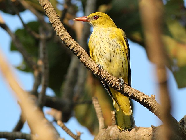 The Indian golden oriole inhabits a range of habitats including open deciduous forests, semi-evergreen forests, woodland, forest edge, mangroves, open country with scattered trees, parks, gardens orchards, and plantations.