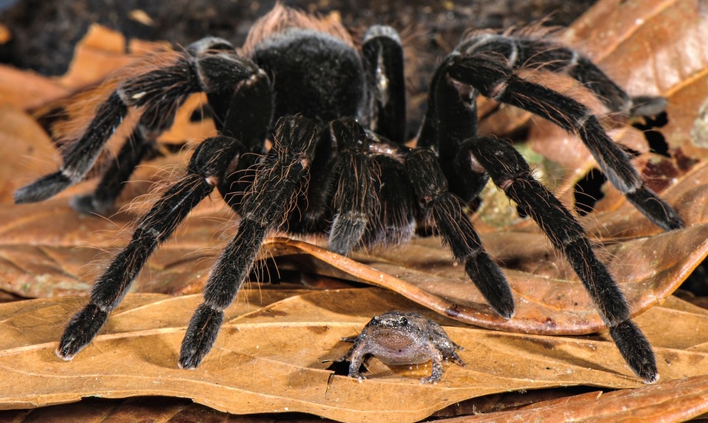 Take, for example, the dotted humming frog (Chiasmocleis ventrimaculata). Found in Bolivia, Brazil, Colombia, Ecuador, and Peru, this frog species is known to have a mutualistic relationship with the Colombian lesserblack tarantula (Xenesthis immanis), an enormous spider with a body length reaching 7 cm (2,75 inches) and a length width reaching 22 cm (8,5 inches).