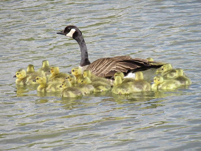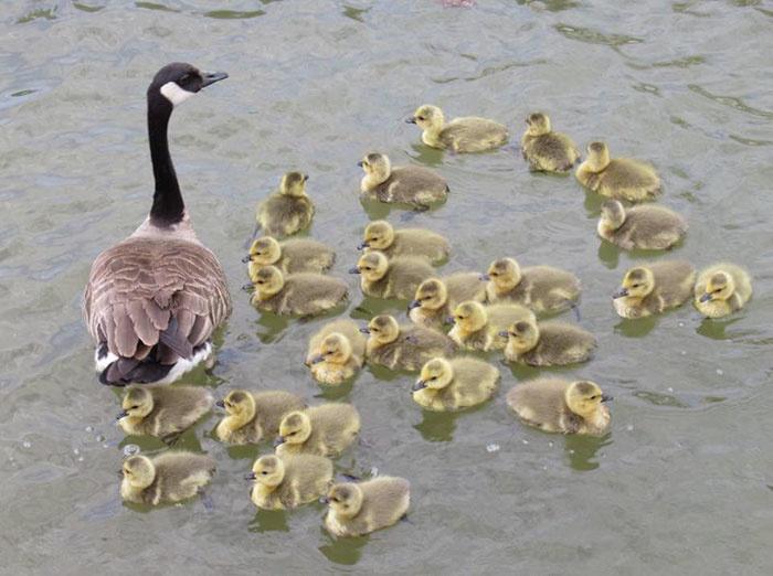 During that time he noticed that one goose had more goslings than usual, or natural. The first time he saw her there were 16 goslings trailing her.
