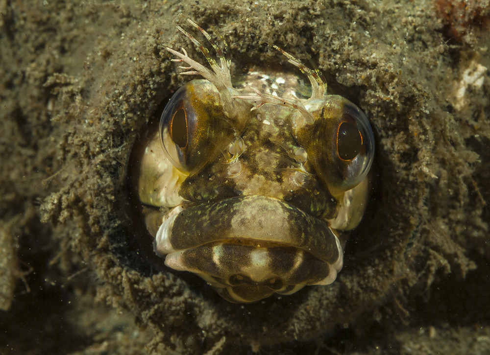 As for that peculiar name: ‘fringehead’ refers to the floppy fronds of tissue falling over the fish’s eyes, while ‘sarcastic’ is thought to either denote the animal’s sardonic closed-mouth expression, or derive from the Greek word sarkázein, which means ‘to tear flesh’.