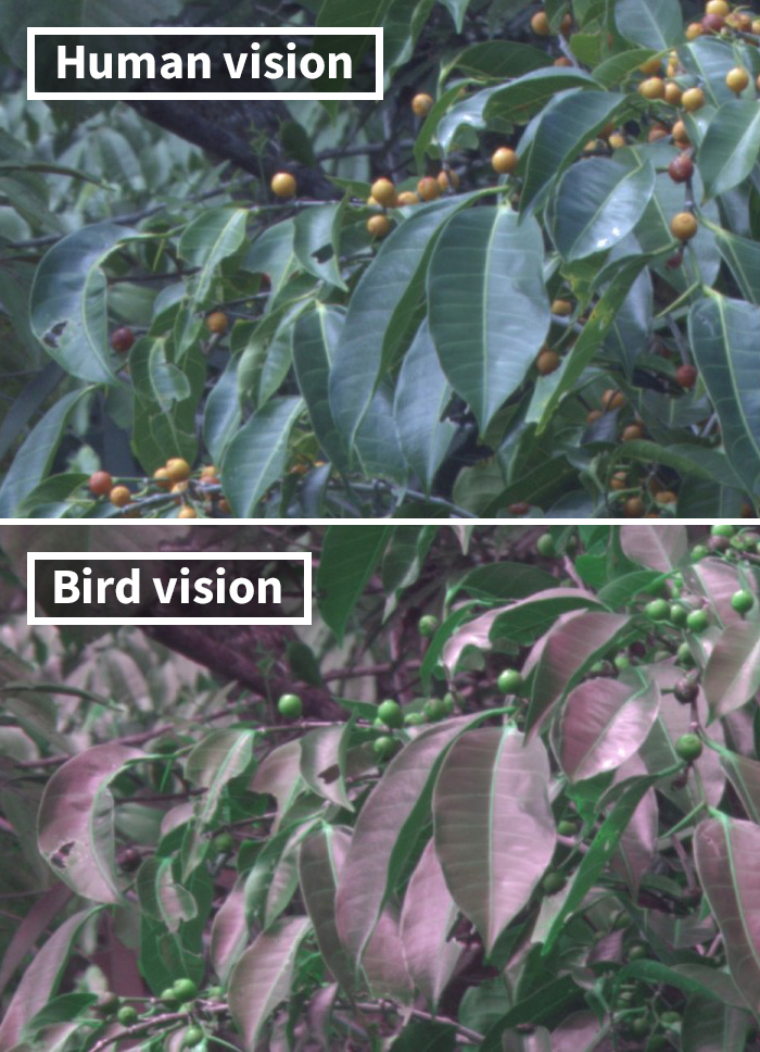 The graphic compares the human spectral field of vision to the bird’s. As birds are tetrachromats, they see four colors: UV, blue, green, and red, whereas we are trichromats and can only see three colors: blue, green, red. Bear in mind, that the magenta UV “color” shown here has been chosen to make it visible for us humans, it is a “false color”, as per definition UV light has no color.