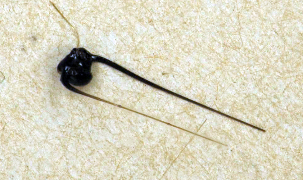Achnelith (Pele’s tear) with two attached threads of Pele’s hair (unrecorded pre-1940s eruption of Kilauea Volcano, Hawaii). Image credit: James St. John
