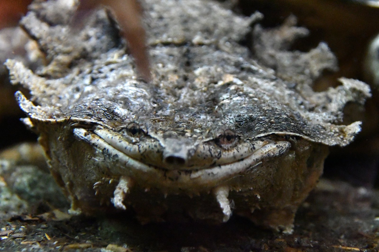 The extremely well-camouflaged mata mata turtle dresses like a piece of bark with spiky ridged scales, and sucks in prey by creating a vacuum. And it appears to be always smiling.