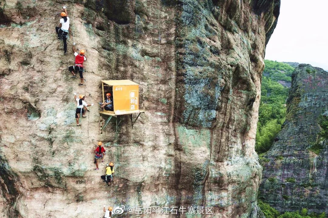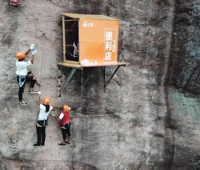 Park officials at Shiniuzhai National Geological Park have opened a convenience store that hangs on the side of a cliff 427 feet (130 meters) high, selling water and snacks for climbers.