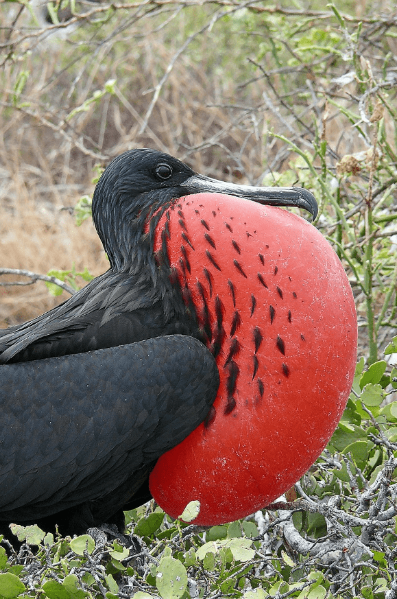 Normally, Christmas frigatebirds live with their mates. The males have a red throat sac that they display to get a mate.