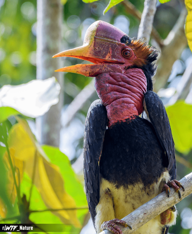 Hornbills are from 1 ft to 3’11″ large. They are known for 2 specific features. One is their eyelashes. The other is their strong neck muscles that make their neck thicker than that of the average bird.