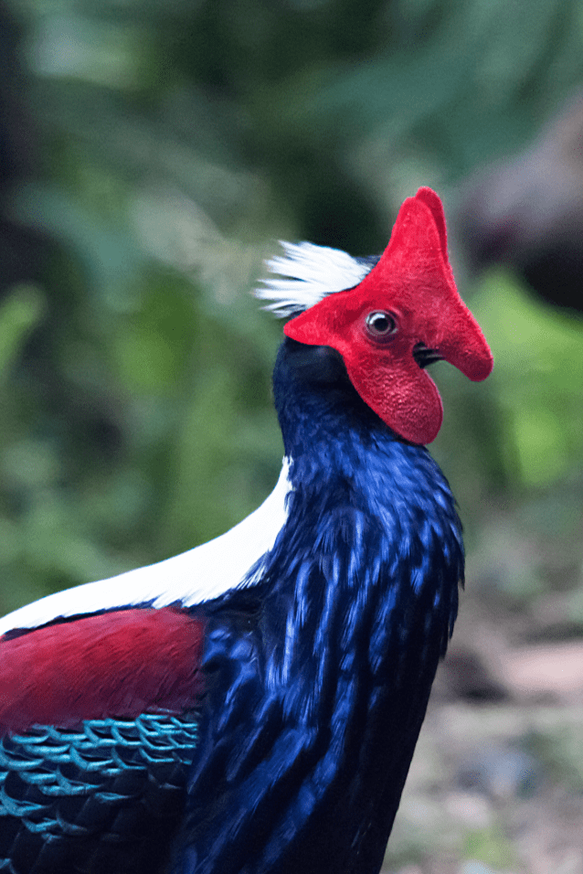 Swinhoe’s pheasant has a very small population these days due to habitat degradation. These pheasants are famous for their blue-purple chest, white nape, red wattles, and white tail and crest, making them bright.