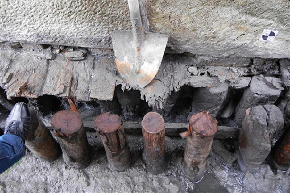 Well, the answer is in extraordinary engineering. Long wooden piles were driven by hand and hammer through the soft mud and silt into the harder clay bed below, called ‘caranto’. Made from a water repellent tree variety such as oak or pine, they were staked close together with mud packed into the gaps for extra stability. Then wooden planks were laid on top, followed by smaller bricks and stones until a large slab of Istrian stone or marble could be put into place on the waterline. These stakes have survived for centuries and are still remarkably preserved, perhaps due to the low oxygen content of the water.