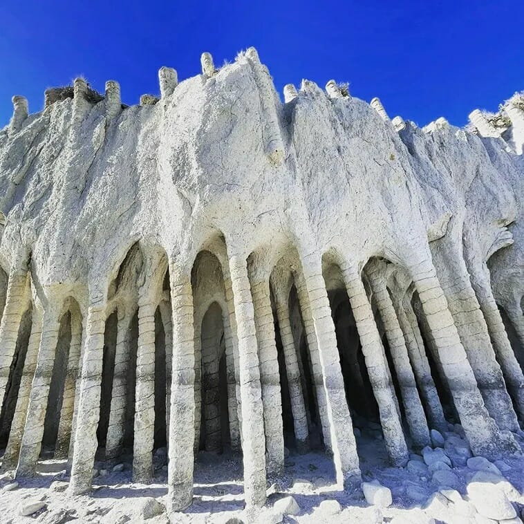 As for the formation of the columns, researchers think that there was a snowfall while the tuff was still hot. So, the still-heated