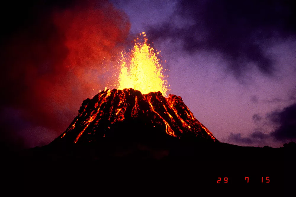 When Kilauea is not smiling. An aerial view of the erupting Pu’u ‘O’o crater on Hawaii’s Kilauea volcano taken at dusk on June 29, 1983, at the beginning of the present volcanic activity. Image credit: G.E. Ulrich, USGS
