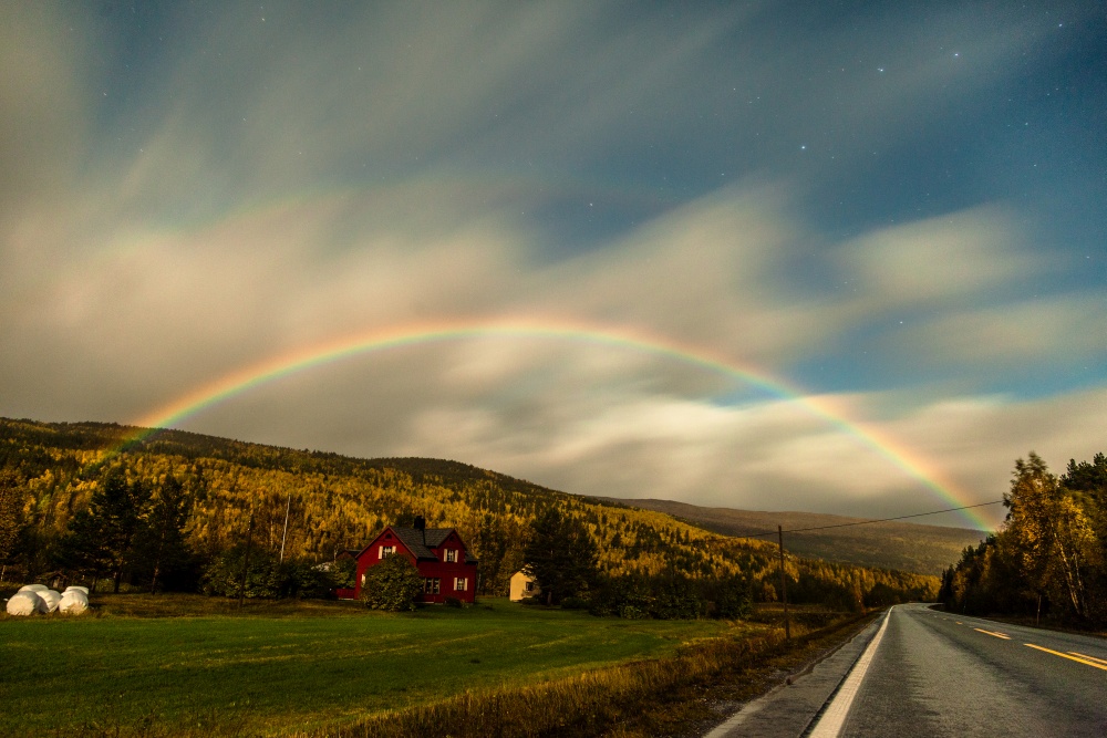 In showery weather, always look for a pale moonbow when the Moon is low and bright. You probably won’t see much colors, but if you mount a camera on a tripod, you can capture the colors easily.
