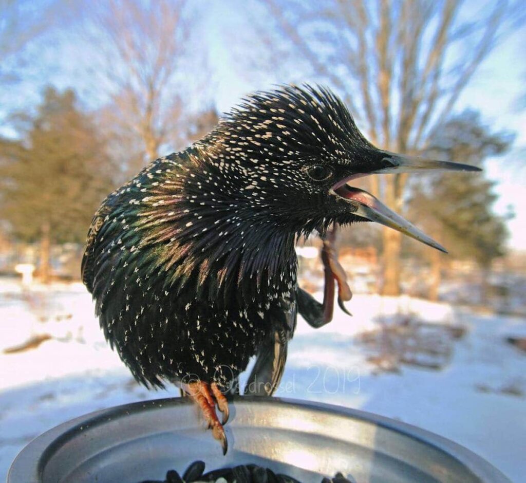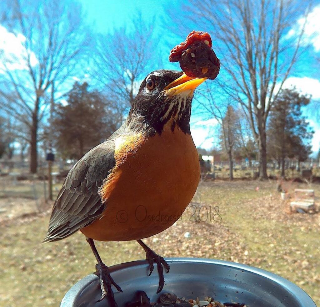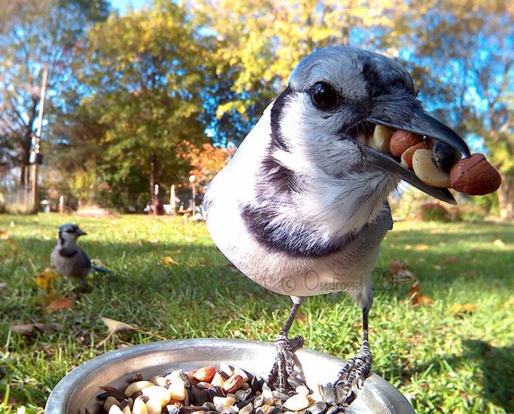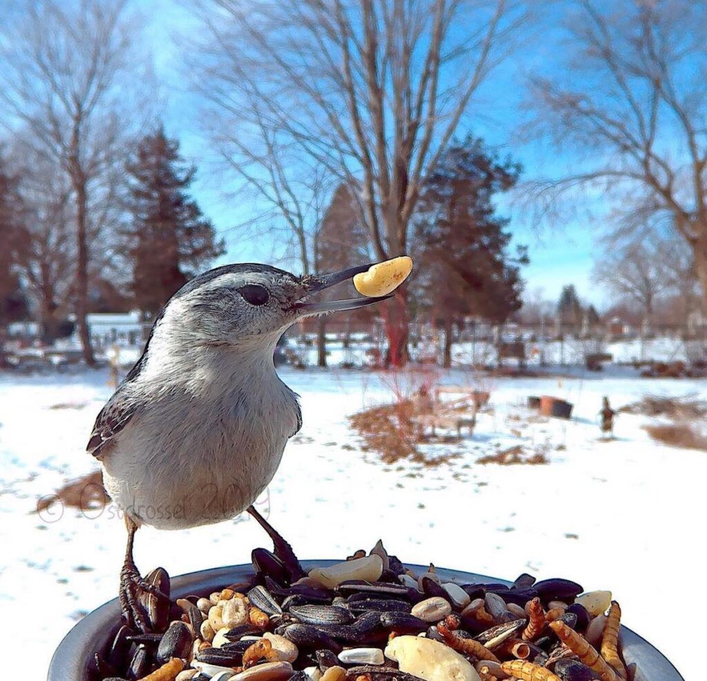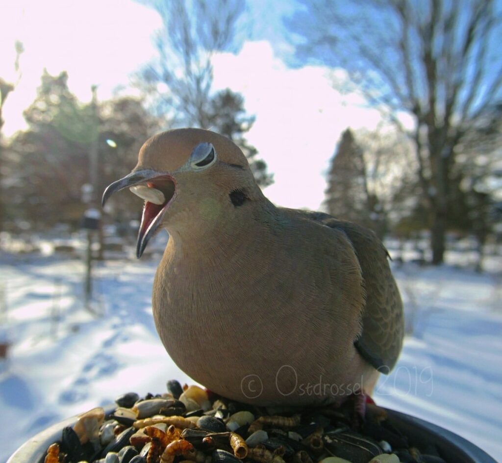Most of the birds are just there to have a snack, one of our favorites is a crow who has a mouthful of kernels making it looks like a toothy smile.